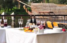 Стеклянный зал - рассчитан на 25 человек. В зале большие просторные окна с которых открывается вид на фруктовый сад и реку Стрижень.