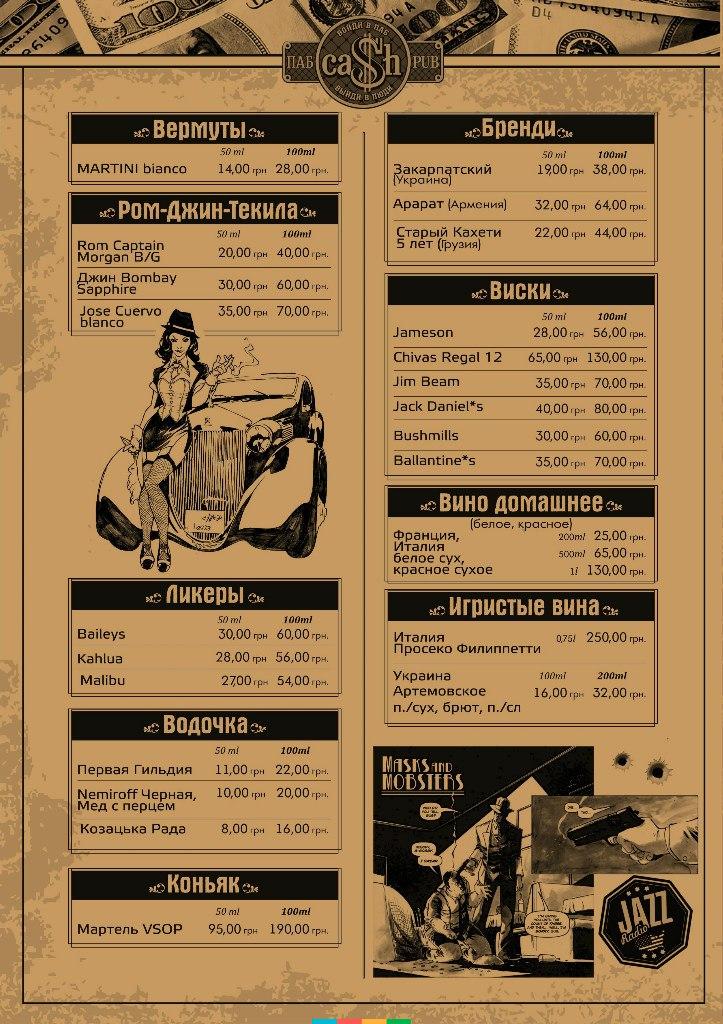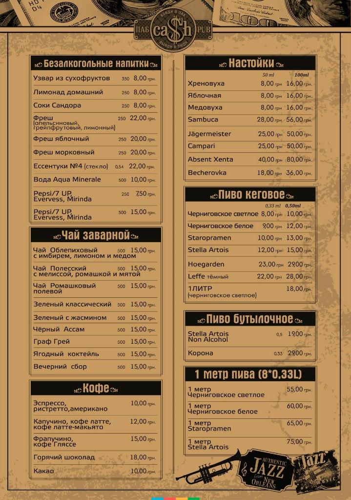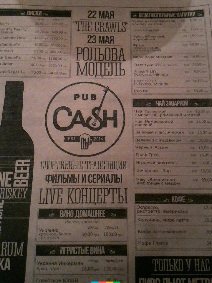 Pub "Cash" - це місце, де можна чудово відпочити з друзями чи родиною. Насолодитися чудовою атмосферою, стильним інтер`єром, посмакувати смачним пивом, соковитими бургерами та духм`яною піцою. В меню ще пропонують: закуски до пива, гарячі страви, холодні закуски, напої, десерти тощо.