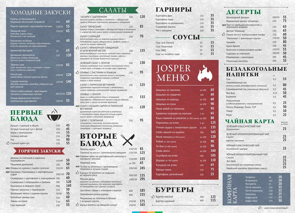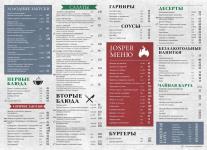 Меню закладу це європейська та українська кухні. Тут Ви можете не тільки скуштувати смачні страви з мангалу, але і поспостерігати за їх приготуванням через вітрину. Асортимен страв гриль тут дуже широкий: шашлики, стейки, овочі гриль, риба гриль та інші смаколики.