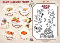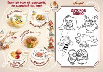 Гостям пропонують європейські, українські та російські страви, які готують за домашніми рецептами в авторській інтерпритації. Також тут присутнє суші-меню. Котлети з кролика, борщ з грінками, вареники, форшмак, бефстроганов з лісовими грибами та вершковим пюре, вершковий торт з ягодами це одні із фірмових страв закладу.
